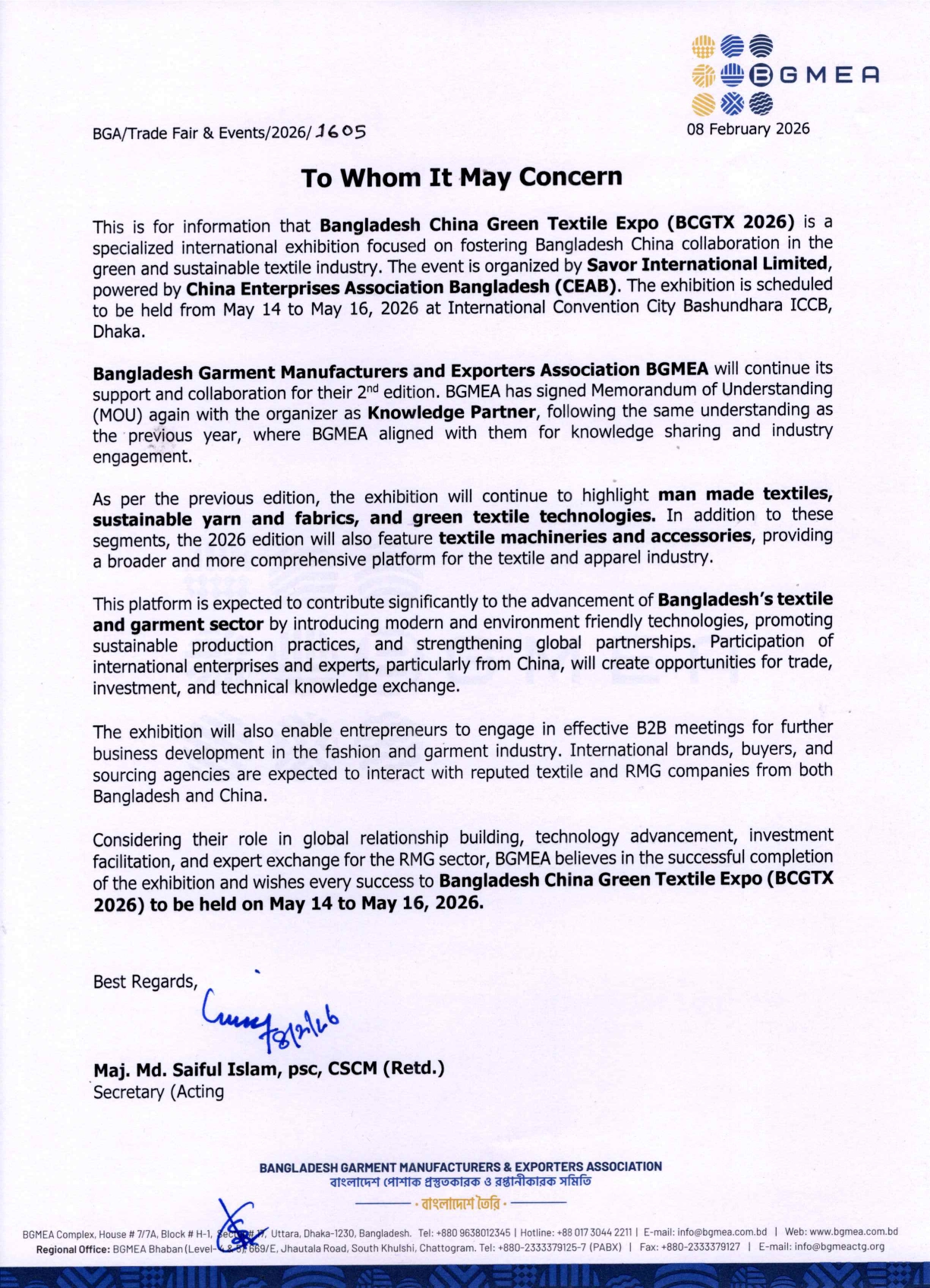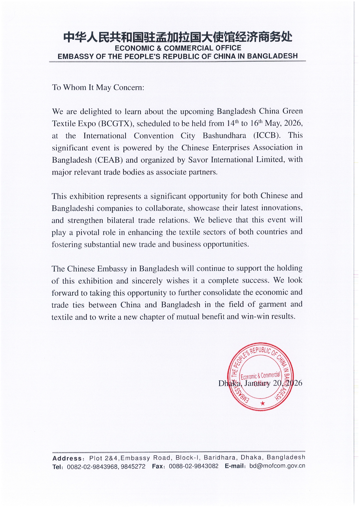 Bangladesh China Green Textile Expo (BCGTX) is Bangladesh’s only bilateral exhibition dedicated to the textile and garment industry, with a strong emphasis on green innovation, sustainability, and advanced technology. The expo addresses the growing demand for eco‑friendly textiles, efficient manufacturing, and sustainable supply chain solutions in one of the world’s fastest‑growing textile markets. BCGTX showcases a wide range of products and technologies, including man‑made fibers, yarns, and fabrics, green innovations, sustainable materials, textile machinery, and garment accessories. The exhibition brings together local and international manufacturers, suppliers, technology providers, industry associations, brands, buyers, policymakers, and investors from Bangladesh and China. Participation in BCGTX offers a strategic opportunity to access Bangladesh’s expanding textile sector, engage with key decision-makers, explore partnerships, stay updated on industry and sustainability trends, and position brands at the forefront of global textile transformation and green development.